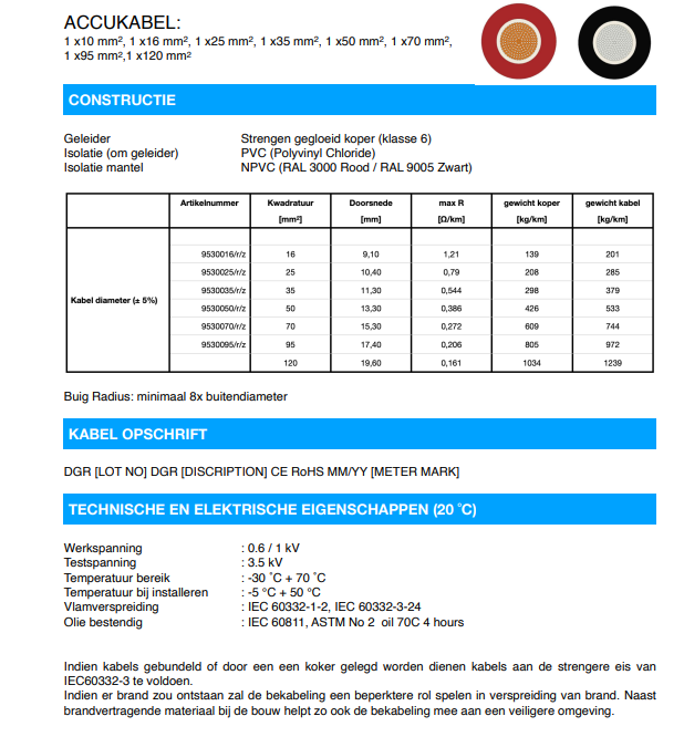 Accukabel 35mm² Dubbel Geïsoleerd IEC 60332-3 verkrijgbaar in de kleuren rood en zwart. Te bestellen per meter of per volle rol van 50 meter. Flexibel, Dubbel Geïsoleerd en Oliebestendig. Wanneer u 3 meter bestelt krijgt u uiteraard een accukabel met een vaste lengte van 3 meter. Vaste lengtes kunnen niet langer zijn dan 50 meter!