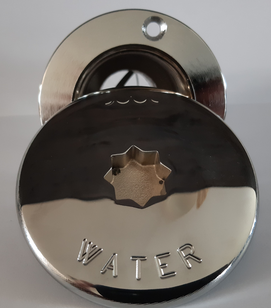Dekvuldop 38 of 50 mm Water verchroomd met sleutel. Deze Dekvuldop heeft een opdruk van water en wordt geleverd met een sleutel om de dekdop mee te open.