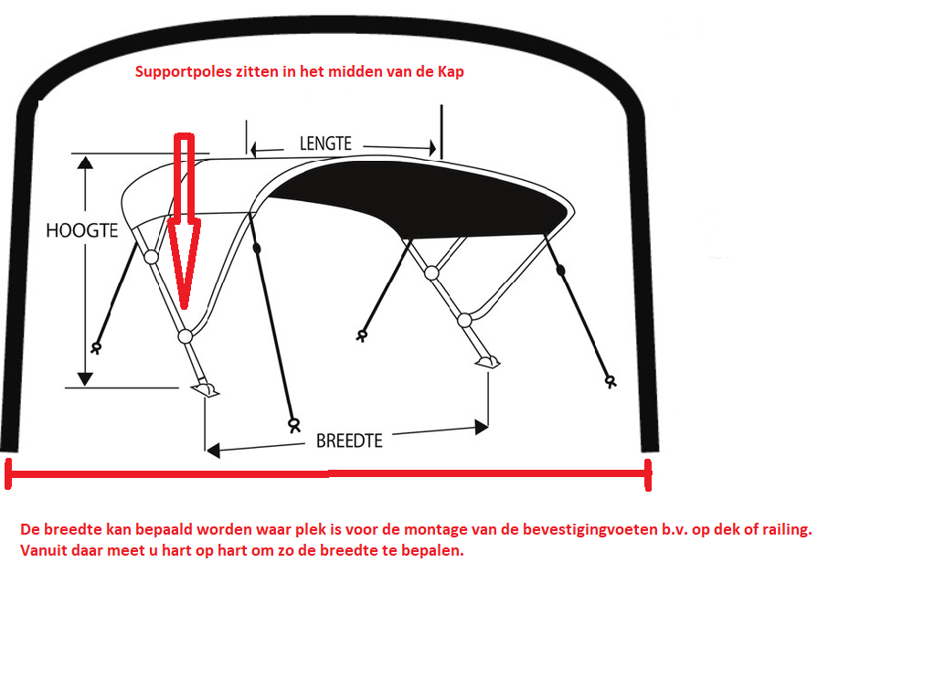 Wat is de juiste breedte voor mijn biminitop? Dit hangt af van de breedte van uw boot, hiervoor kijkt u eerst naar waar de biminitop bevestigd dient te worden (de montagevoeten van de buizen). Vervolgens meet u deze hart op hart maat op om zo de breedte te bepalen.