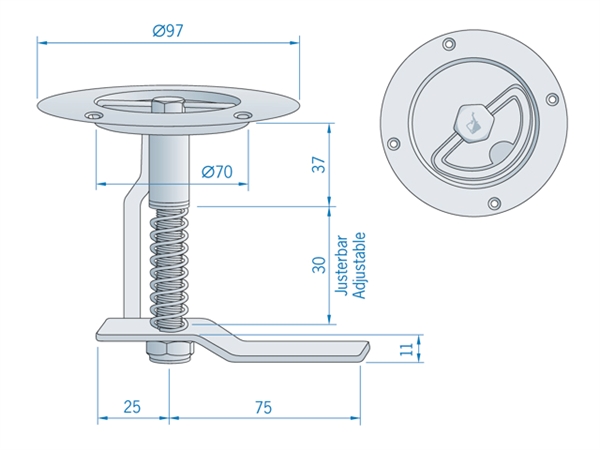 Diameter van de flens 97 mm. Totale lengte 108 mm. Wordt met rechte schoot geleverd. Leverbaar in twee typen: veerbelast of niet veerbelast. Gemaakt van RVS.