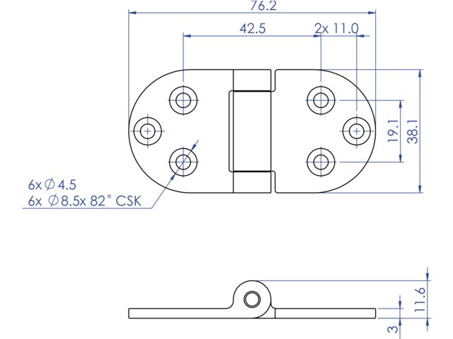 Scharnier van RVS316. Dit speciale scharnier is voorzien van een ingebouwde weerstand om lichtere luiken of kleppen open te laten staan in de gewenste positie, waardoor het gebruik van een veer, uithouder of cilinder overbodig wordt. Het scharnier heeft een houdkracht van ca. 30kgf-cm (+/- 15%) en houdt deze ca. 20.000 bewegingen. Dikte materiaal is 3mm.
