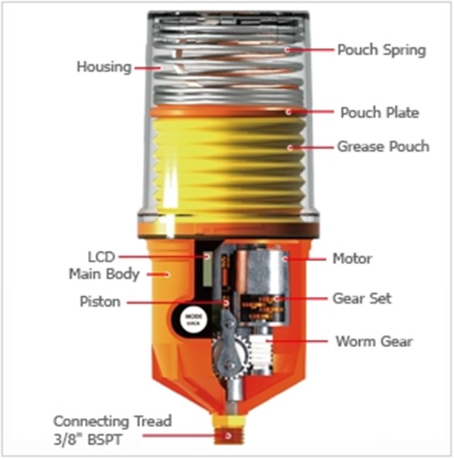 Dit automatische vetsmeerapparaat is de ultieme manier om vetsmering te automatiseren en te centraliseren. Het apparaat is zeer krachtig, waardoor het niet noodzakelijk is om het apparaat in de buurt van het te smeren punt te plaatsen. Tot op een leidingafstand van 10 meter kan de Pulsarlube zonder drukverlies smeren. Werkt op patronen van 250cc. Deze vetpomp smeert automatisch 24 uur per dag, met 6 instelbare doseringen van een 1/2 maand tot 12 maanden. Het ingebouwde LC Display is duidelijk afleesbaar en met de drukknoppen is de Pulsarlube snel naar wens ingesteld. Voor dit apparaat is ook een zogenaamd Service Pack beschikbaar, dat bestaat uit een vetpatroon met 250cc PL-1 Multi Purpose vet, een batterijset, een sticker waarop type vet, installatiedatum en verloopdatum kunnen worden genoteerd en een afdekhoes om het apparaat schoon te houden. Type M werkt op een batterijset van 4,5 V. Werkdruk : 5 bar Mogelijke instellingen : 1/2, 1, 3, 6, 9 en 12 maanden en reiniging (P) Dosering : 0,34 cc/slag Temperatuurbereik : -20°C tot +60°C Certificering : Ex ia IIC T4 / IP54.